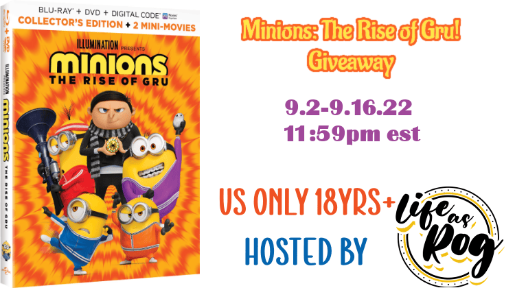 Welcome to our Minions: The Rise of Gru Blu-ray Combo Giveaway. YOU may be the lucky person to win this fun Blu-ray Combo, but only if you enter! The biggest global animated franchise in history adds an all-new laugh-out-loud gru-vy movie in Illumination’s MINIONS THE RISE OF GRU, available to own with over 60 minutes of despicably entertaining bonus features on Digital on August 30, 2022, and on 4K UHD, Blu-rayTM and DVD September 6, 2022, from Universal Pictures Home Entertainment.