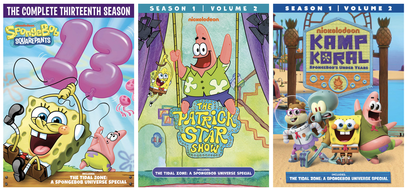 LOS ANGELES– XX, 2023 – The SpongeBob multidimensional universe continues to grow with three brand-new DVD releases! Prepare for another hilarious season with SpongeBob and other beloved Bikini Bottom residents in SpongeBob SquarePants: The Complete Thirteenth Season. Step into the whimsical mind of Patrick Star as he puts on his very own variety show on The Patrick Star Show: Season 1, Volume 2. Join young SpongeBob, Patrick, Sandy, and a teenage Squidward for classic summer camp fun in Kamp Koral: SpongeBob’s Under Years – Season 1, Volume 2. Make your way through each dimension in the epic crossover episode “The Tidal Zone: A SpongeBob Universe Special” where all three shows collide! This hour-long first-ever crossover special is included on each DVD.