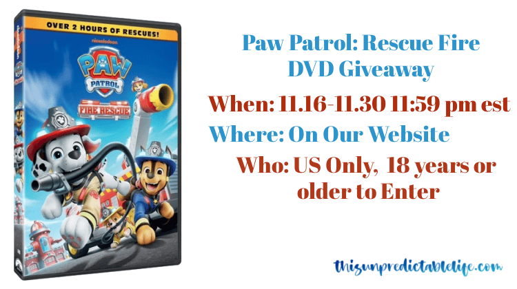 Welcome to the Paw Patrol Fire Rescue DVD Giveaway. Will you be the lucky winner? You will only have a chance if you enter! At the end of the giveaway, 1 winner will receive this fun DVD.