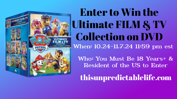 Welcome to our PAW Patrol The Ultimate Film & TV Collection DVD Giveaway. One winner will receive this DVD collection at the end of the giveaway. This prize is a retail total price of $44.99. You can find it online or at the location where most DVDs and Blu-rays are found. To read more about this collection, you can go here.
